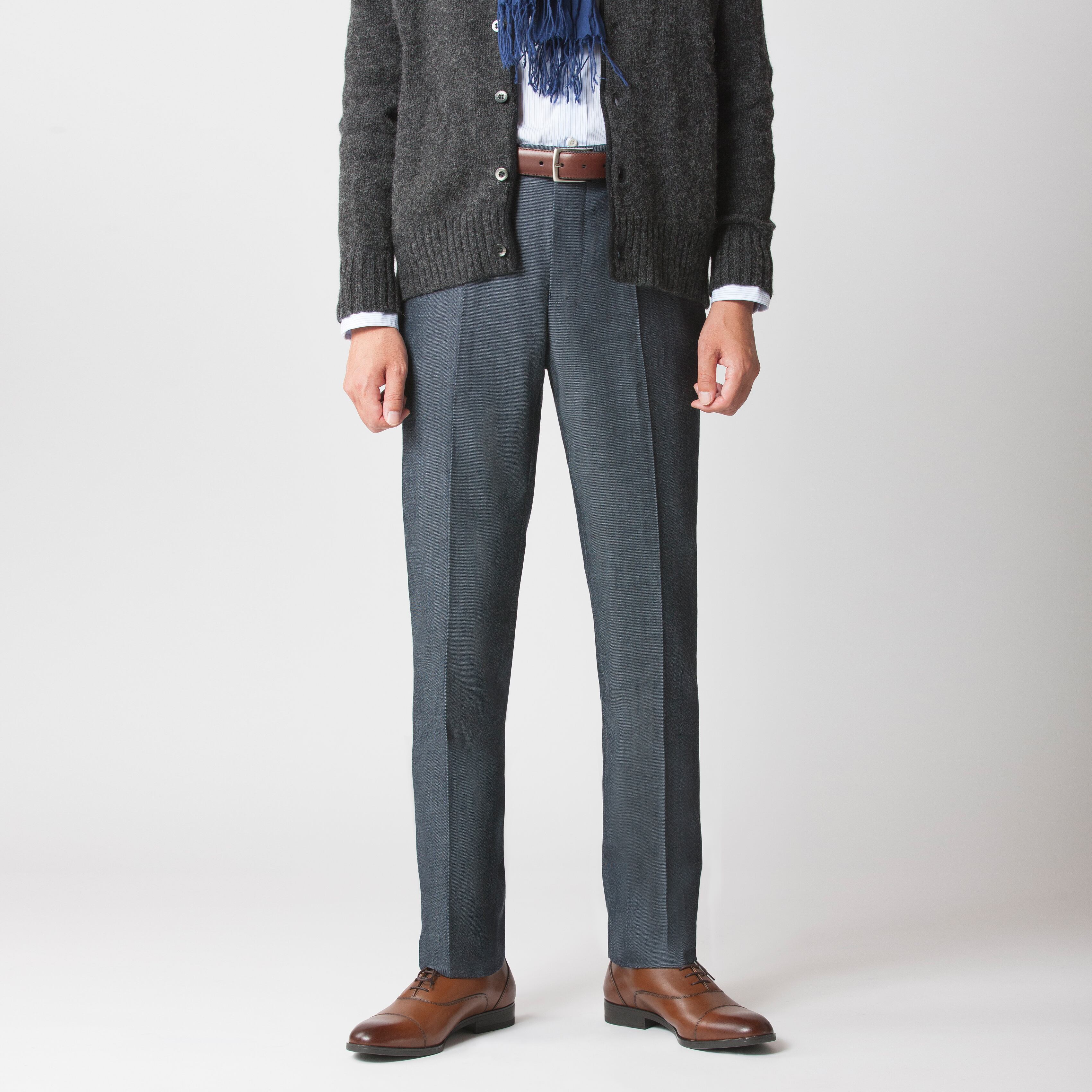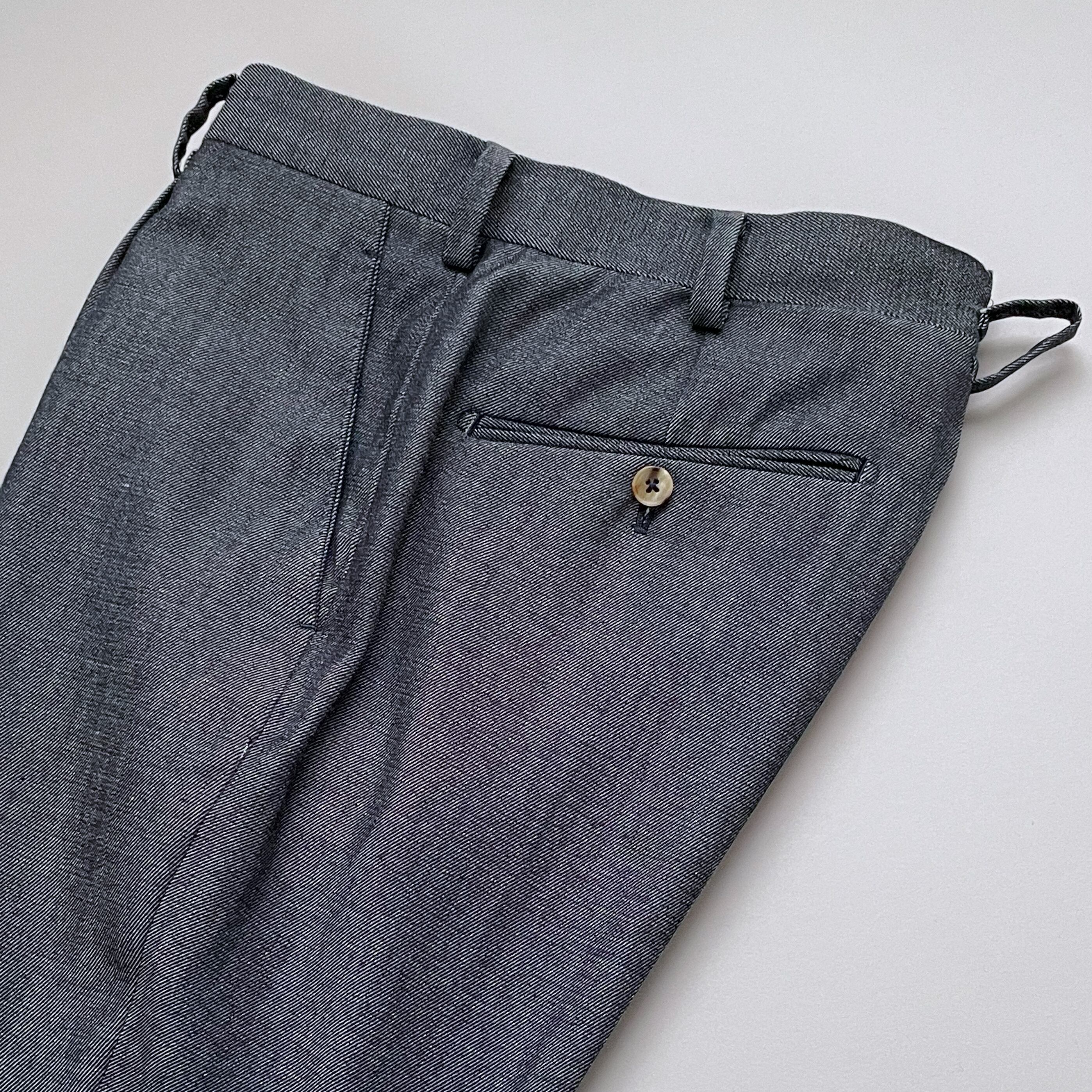 Denim-like fabric. Wool and cotton are woven together to achieve both a supple wet feel and a silky feel, giving it an exquisite texture. Although denim-like, the moderate sheen that is not too assertive and the calm blue-gray color make this one a good choice for business occasions.