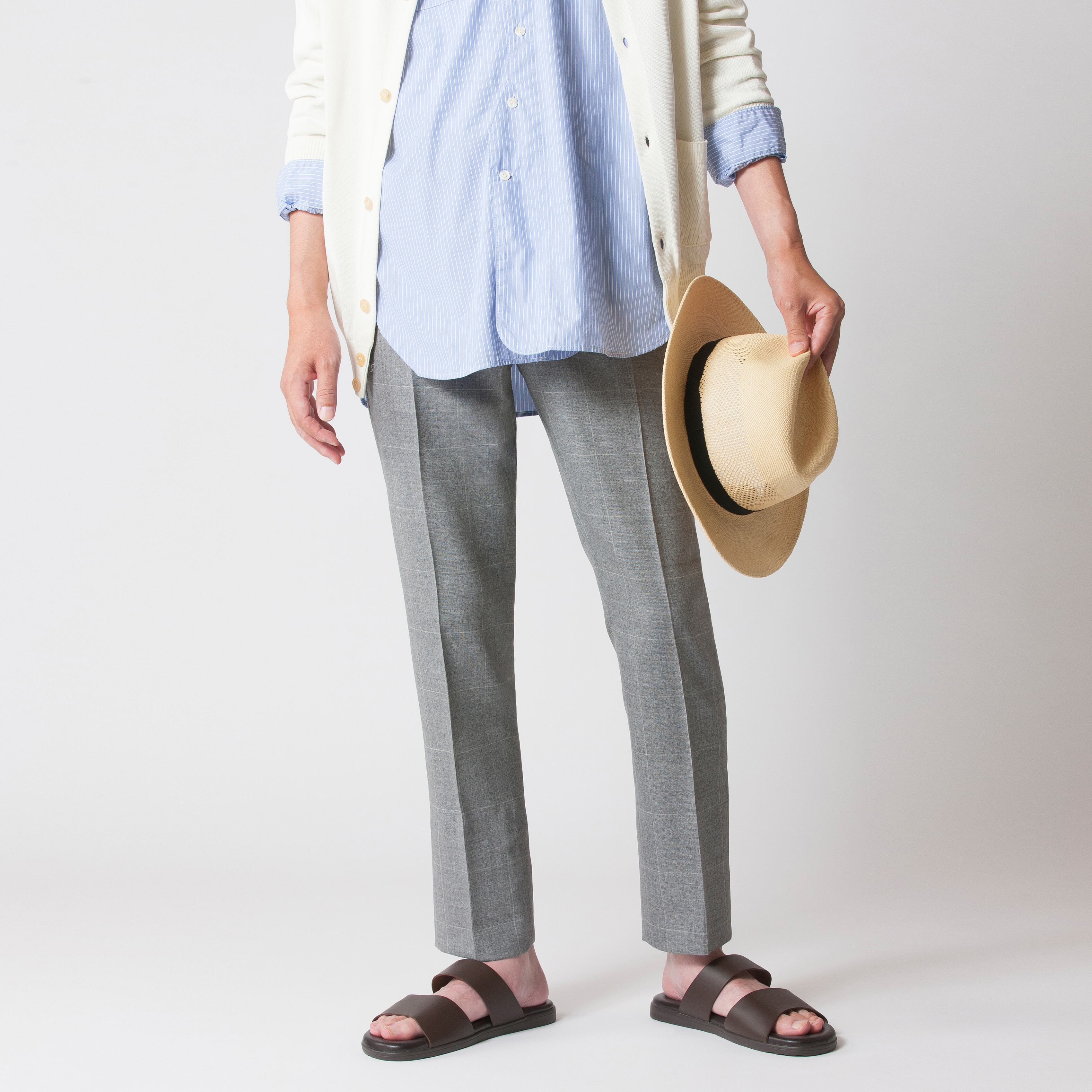 葛利毛織の定番生地で人気の高いサマージェントリークローズから、ライトグレーチェックをセレクト。シャリ感をやや強めに仕上げた生地のため、さらりとした肌ざわり。大柄のチェックがアクセントになっているので、ポロシャツなどと組み合わせてカジュアルに着こなすのもおすすめ。