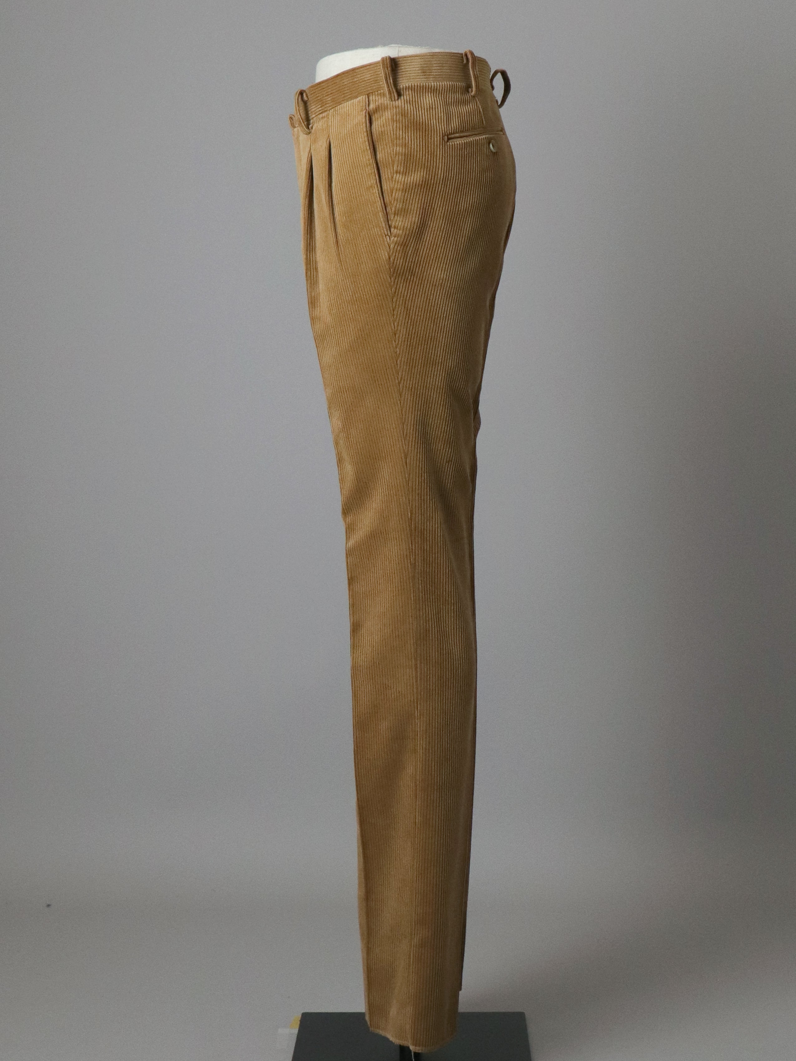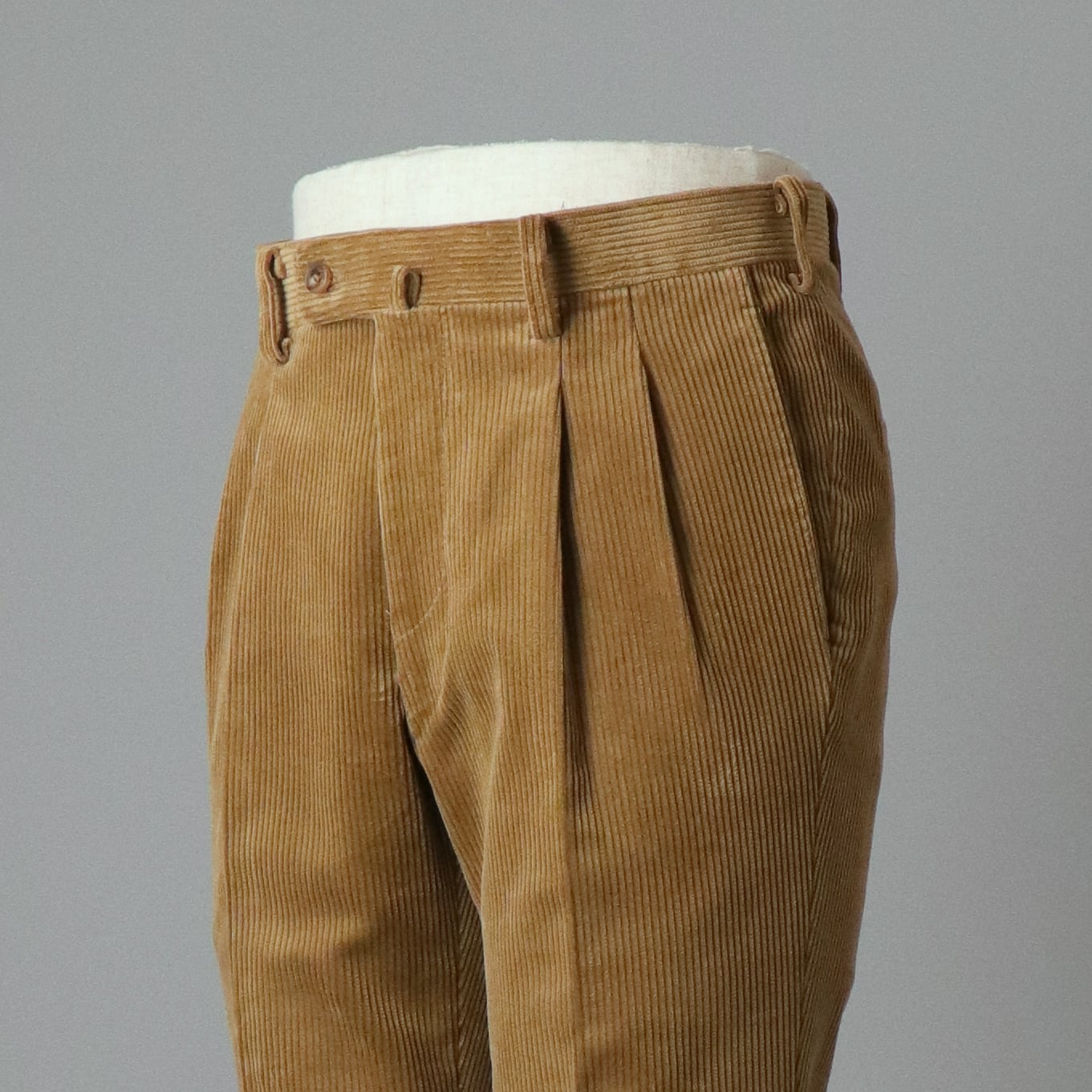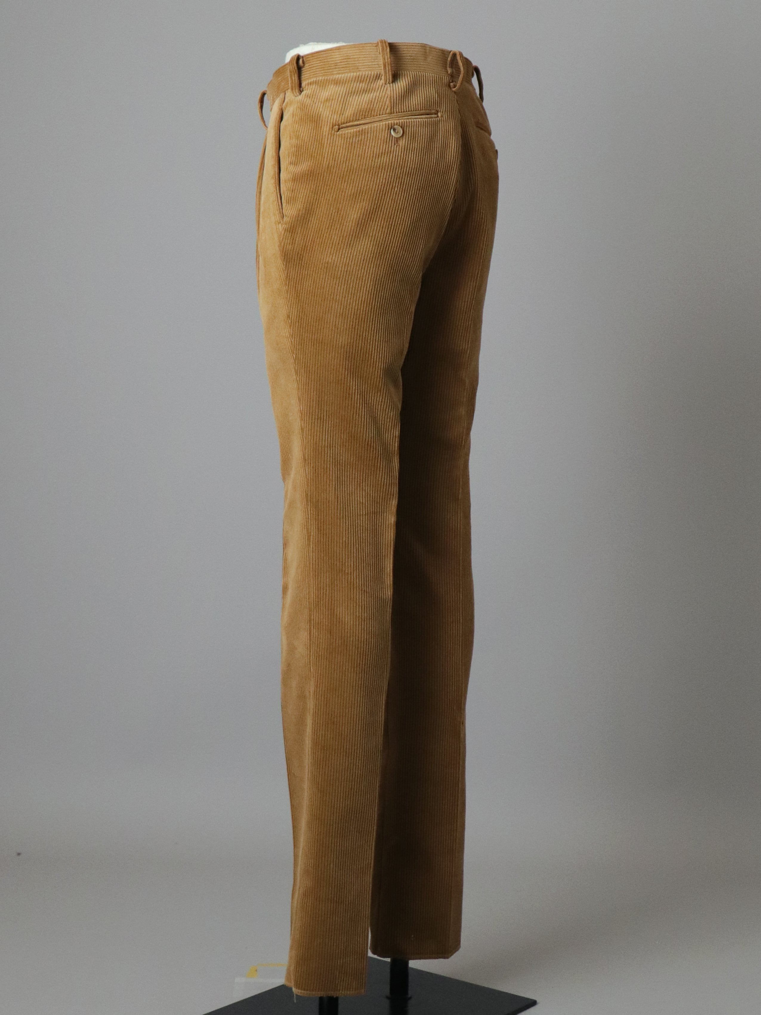日本が誇る遠州(浜松)産の高品質なコーデュロイ生地です。8ウェールのベーシックな畝幅で、目付も485gとしっかりと織り上げられています。ヘビーウェイトで緻密な織りはその光沢感とともに重厚かつ高級な印象を与えます。