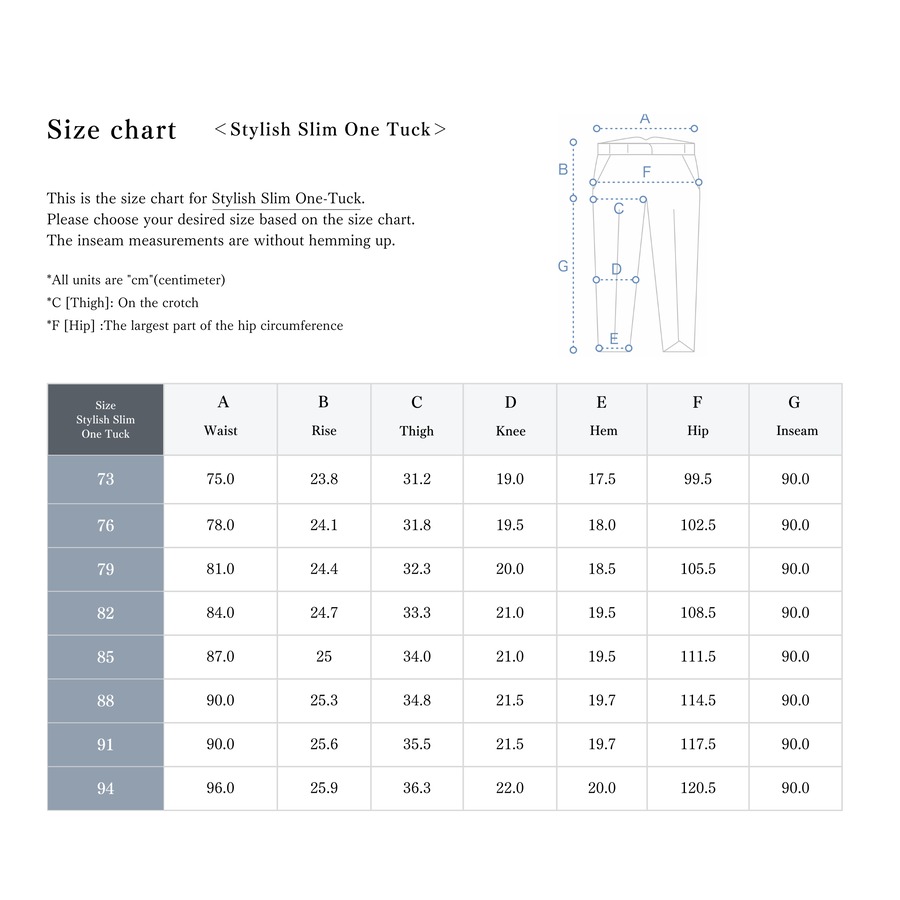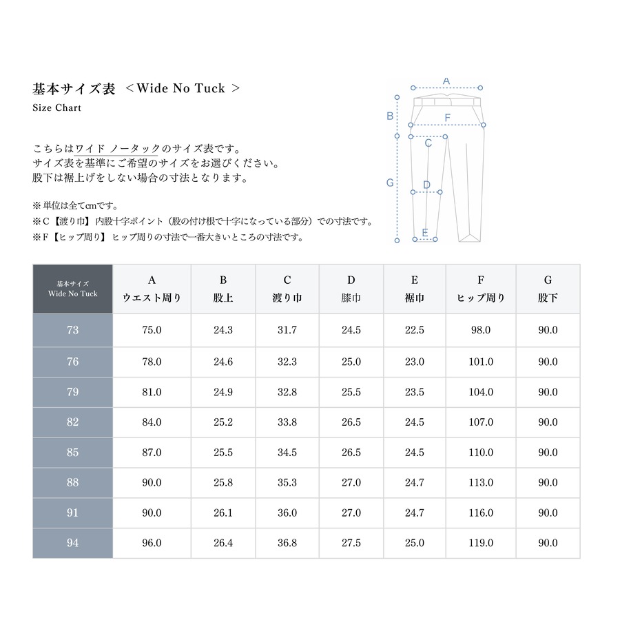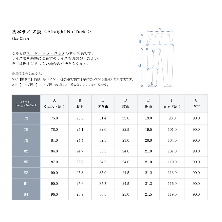 ・裾上げをご希望の場合は、裾上げ種類と股下寸法をご指定ください。