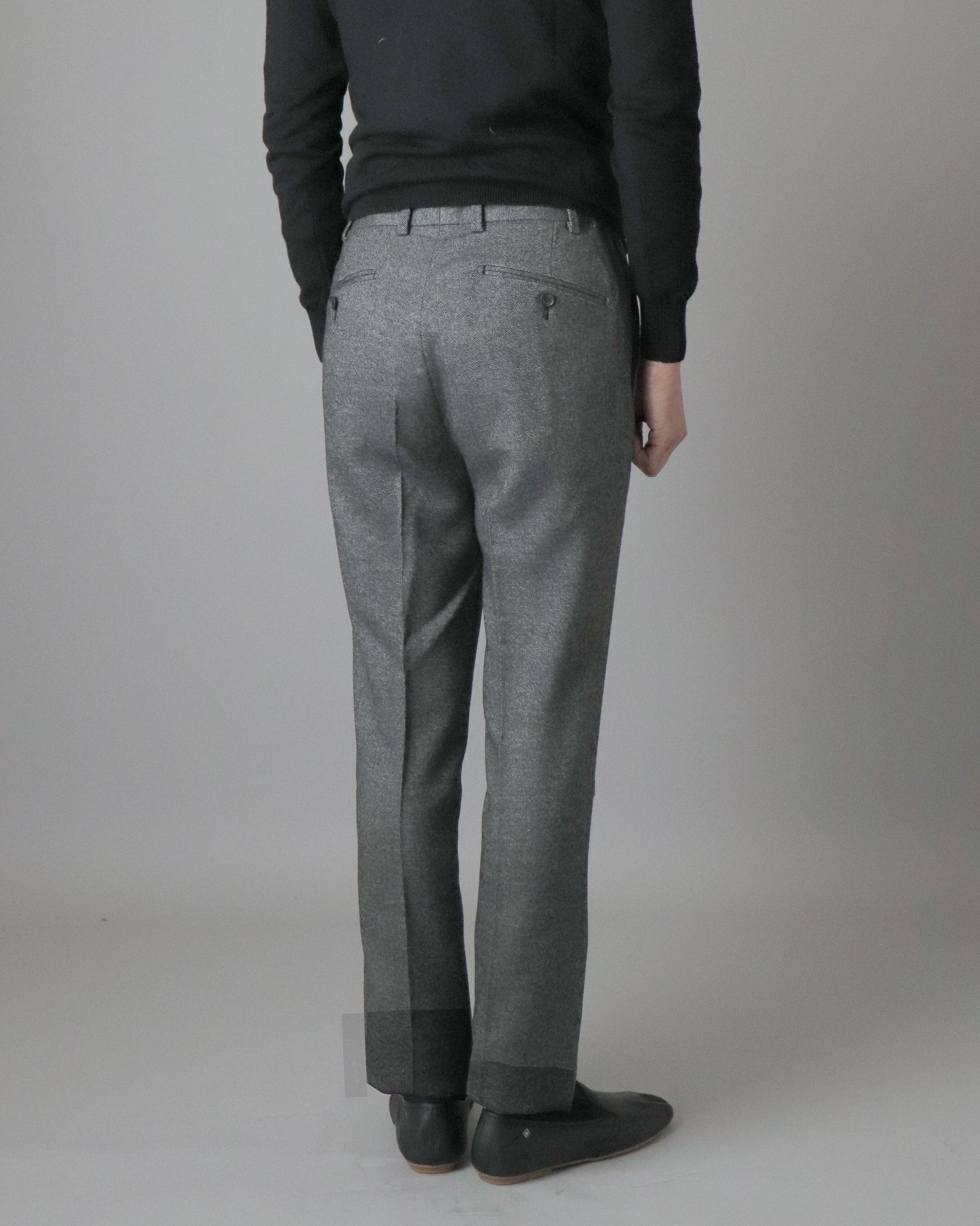 ホームスパンツイードですが、肌触りはなめらか。若干ストレッチも効いているので、履き心地もいいです。色味はダークグレーで、チャコールグレーよりも濃い目の色合いがシックな雰囲気を醸し出します。